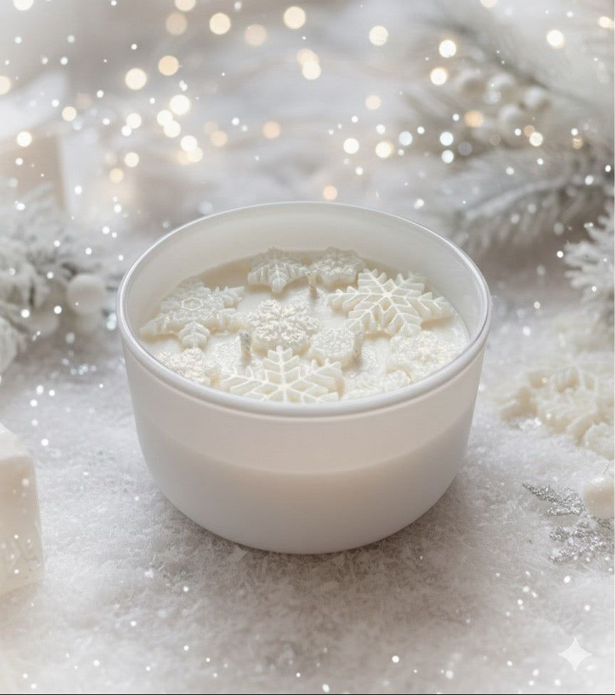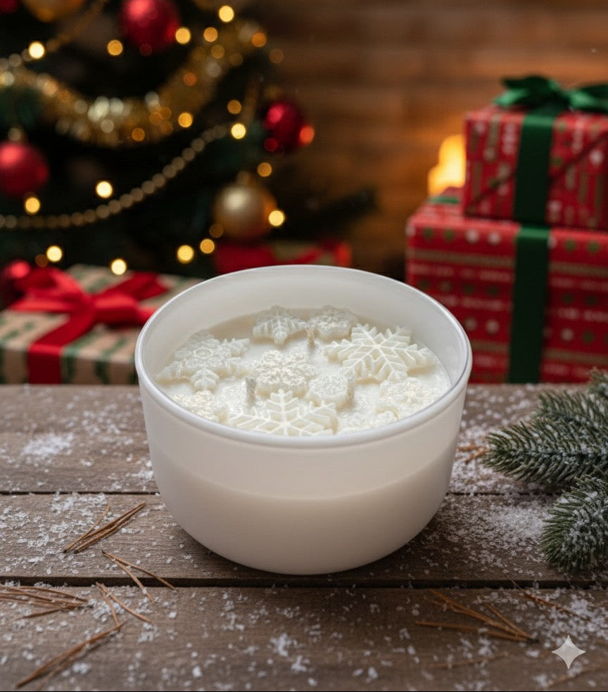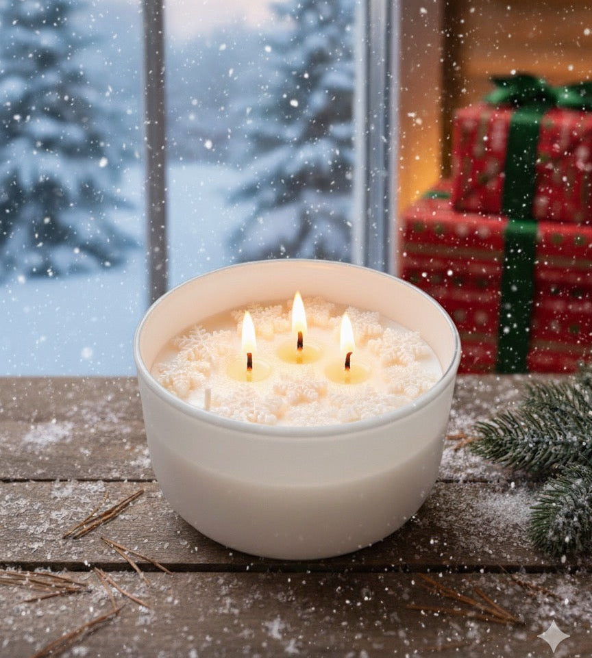 Nuestra vela de 8 oz está pensada para llenar tu hogar de calidez y encanto durante la temporada invernal. Con su diseño decorado con copos de nieve incrustados, se convierte en ese detalle especial que no solo ilumina, sino que también transforma el ambiente con fragancias inolvidables.
