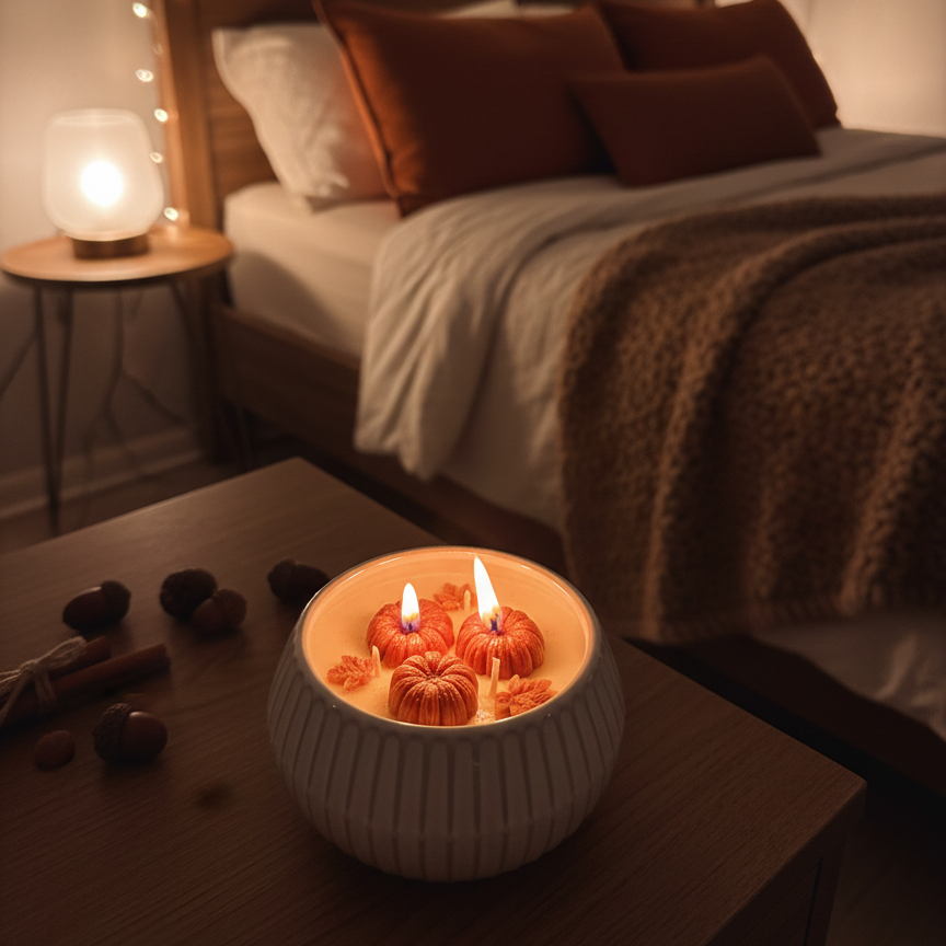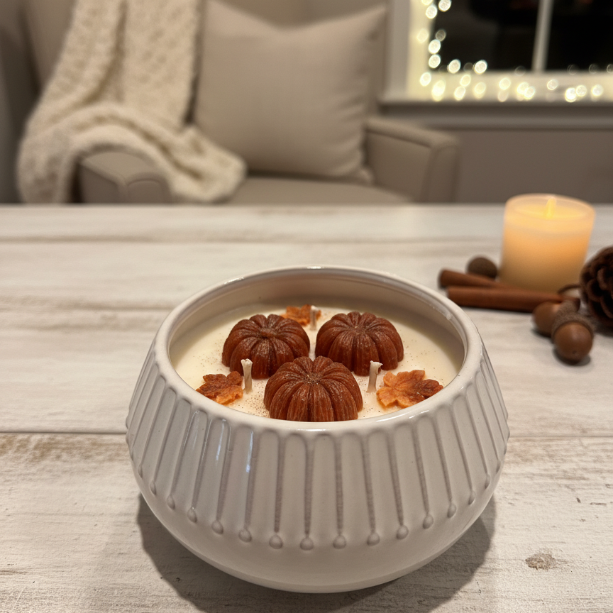 Una vela artesanal de 15 oz que combina decoración y aroma en una sola pieza. Adornada con pequeñas calabacitas que realzan su diseño otoñal, esta vela está elaborada en dos capas de fragancia (layered) que transforman la experiencia a medida que se consume: