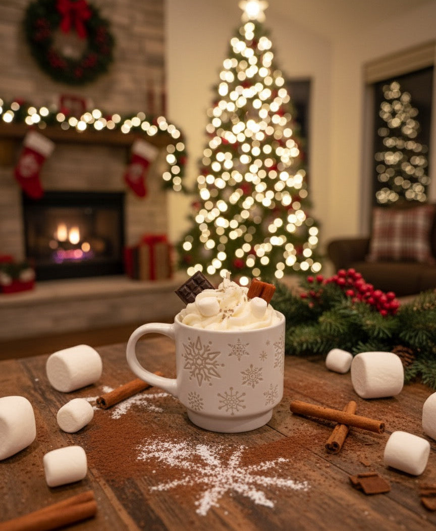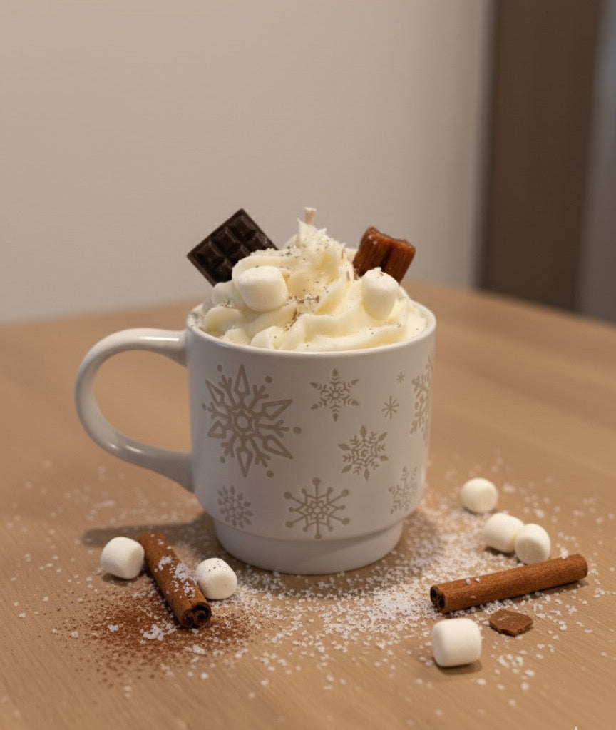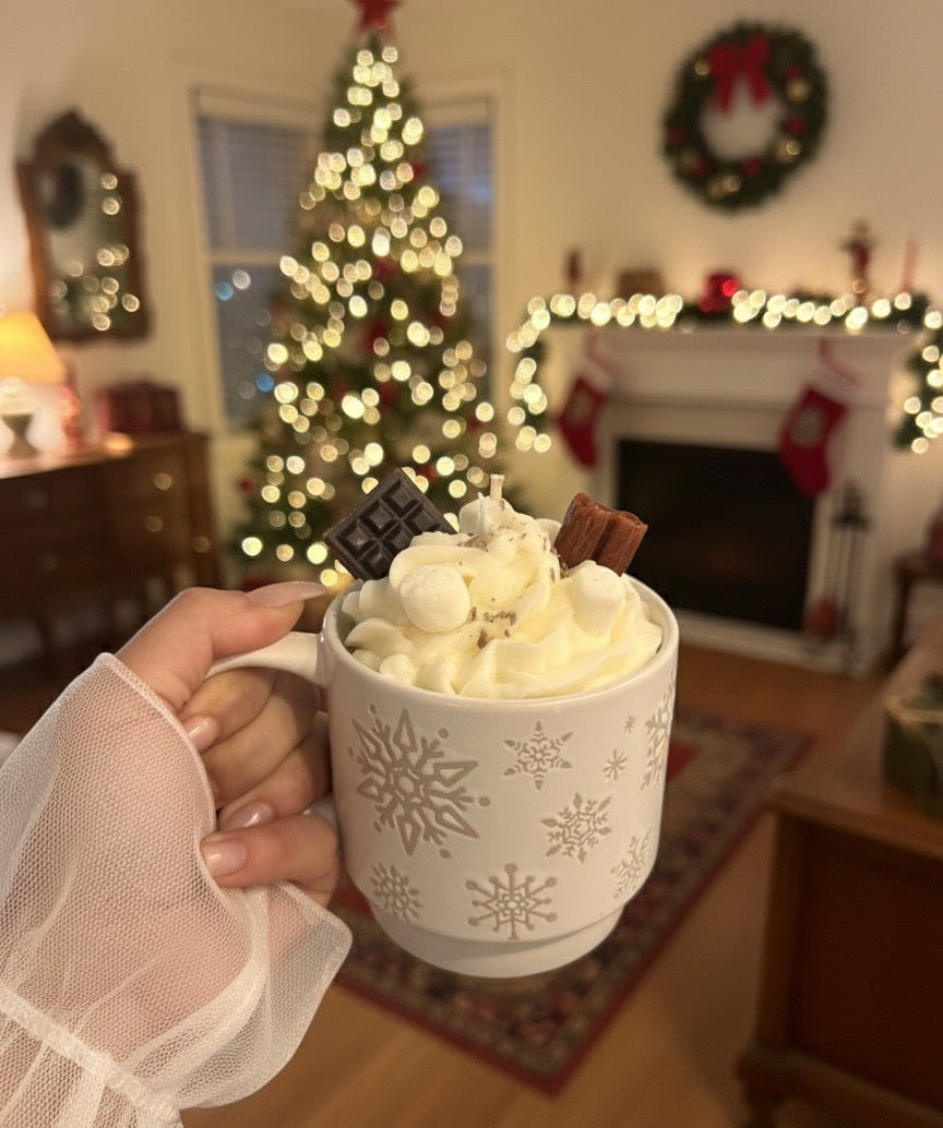 • Vela artesanal de 12 oz con diseño realista de hot cocoa
