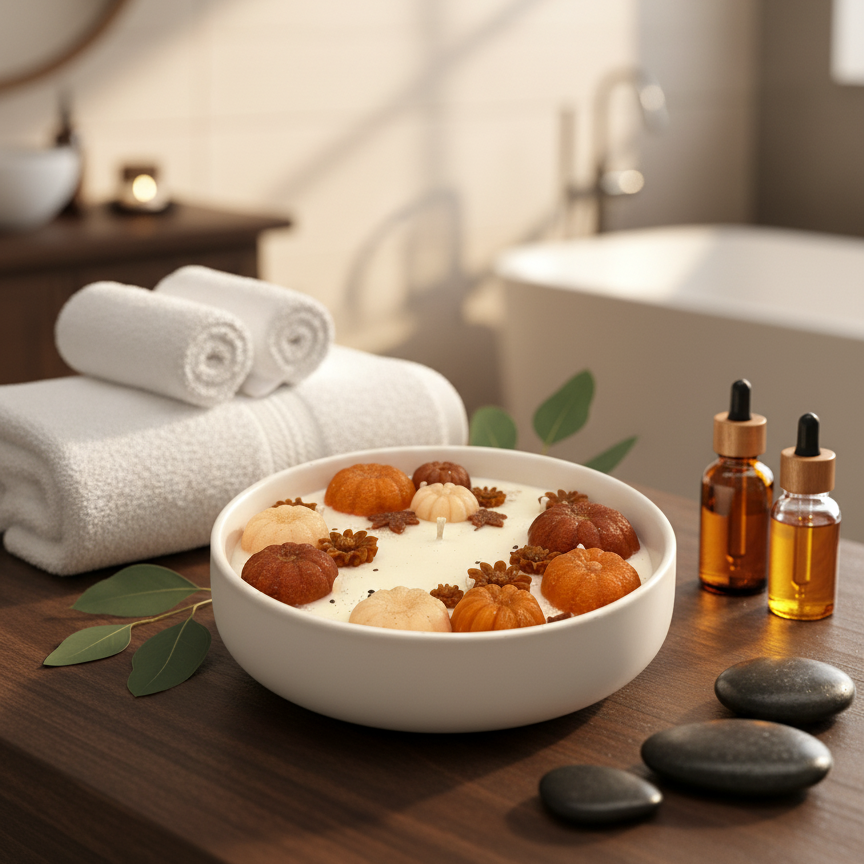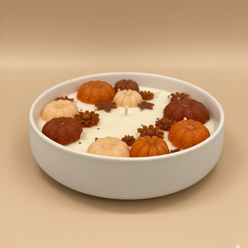 Una vela artesanal única, creada como una verdadera obra de arte para transformar cualquier espacio. Inspirada en la calidez de la temporada y en la tranquilidad de un spa en casa, esta vela combina estética y bienestar en un mismo diseño. Cada detalle —desde las pequeñas calabazas hasta la delicada decoración natural— la convierte en una pieza decorativa que también envuelve el ambiente con una fragancia cautivadora y sofisticada.