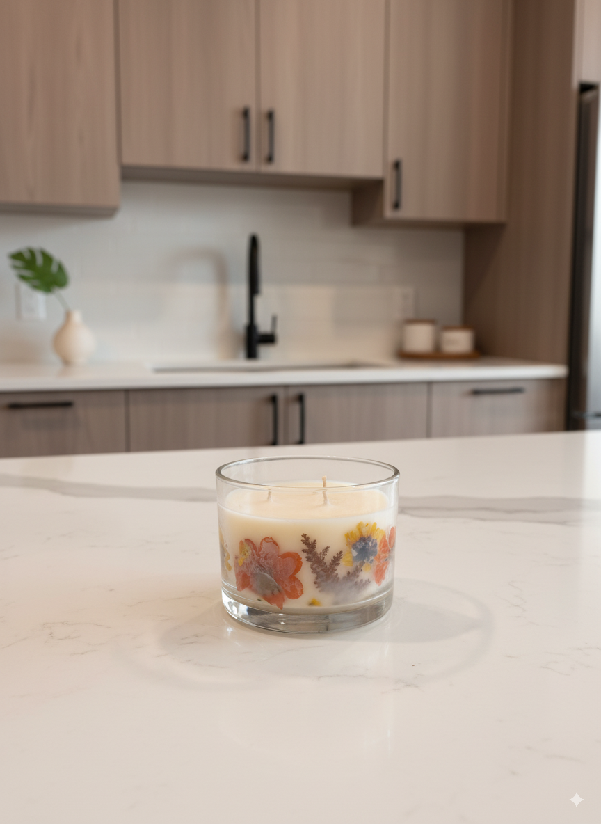 Una vela artesanal de 12 oz, diseñada para ser tanto un elemento decorativo como una experiencia aromática. Su detalle especial son las flores incrustadas alrededor del contenedor, pensadas únicamente con función decorativa para realzar la estética de la pieza. Estas flores no deben acercarse a la llama ni a los pabilos durante el uso.